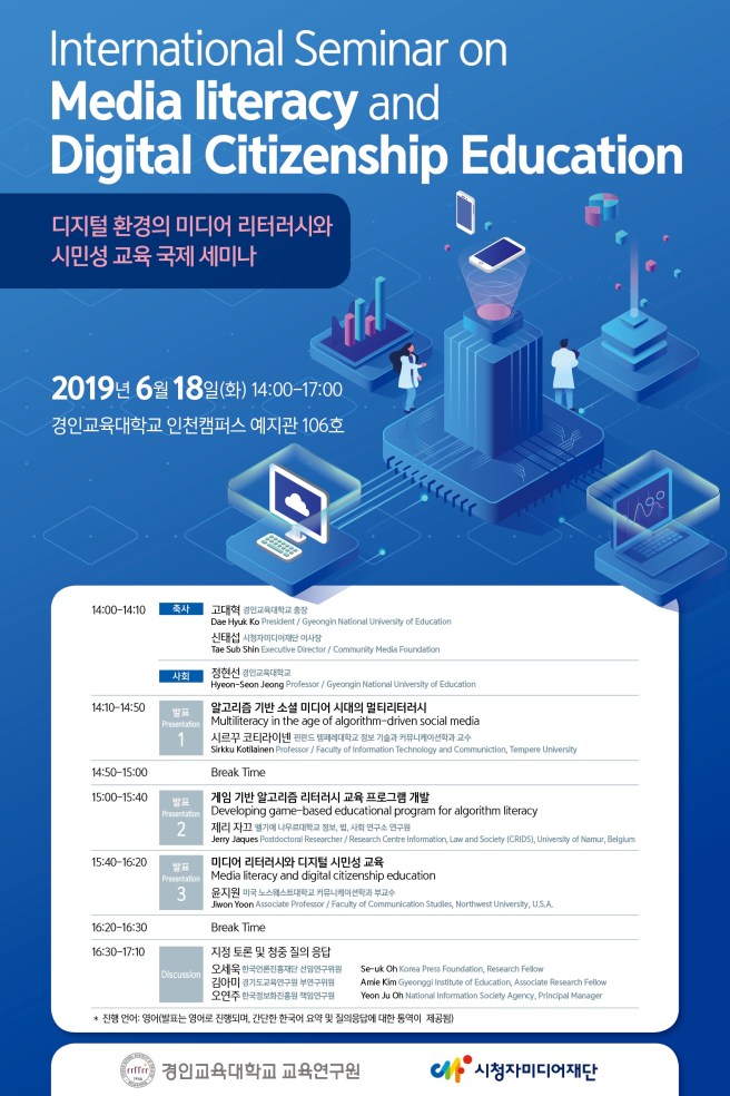 경인교육대학교 인천캠퍼스에서 6월 18일(화)에 “디지털 환경의 미디어 리터러시와 시민성 교육 국제 세미나”를 개최합니다. 제가 좋아하는 말 중의 하나가 “One thing leads to another.”라는 말인데요, 우연이 인연을 만들고, 인연이 네트워크를 만들고, 그것이 다시 좋은 기회를 만든다는 생각이 듭니다. 미디어 리터러시를 키워드로 한 다양한 국내외 학술대회, 자문회의, 교육 프로그램, 온라인 공간을 통해 인연을 맺어온 분들을 모시고, 우리 대학 캠퍼스에서 미디어 리터러시 학술 세미나를 개최하게 되어 개인적으로 매우 기쁩니다. 그리고 제가 대학에서 봉사 중인 교육연구원에서 개최하고, 시청자미디어재단에서 공동 주최로 힘을 보태주셔서 더욱 감사하게 생각합니다.