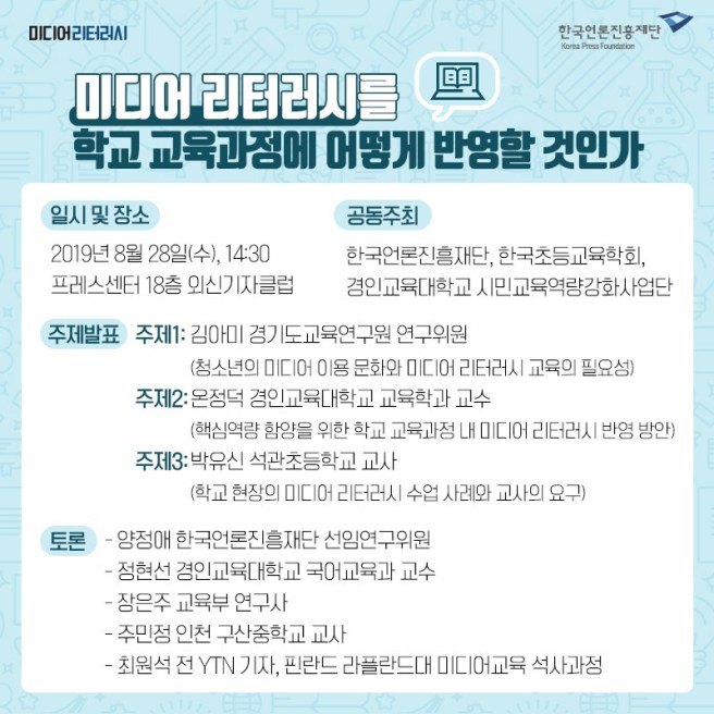 “미디어 리터러시를 학교 교육과정에 어떻게 반영할 것인가”를 주제로 한 세미나가 8월 28일(수) 프레스센터에서 개최되었습니다. 한국초등교육학회, 한국언론진흥재단, 경인교육대학교 시민교육역량강화사업단이 공동주최한 세미나입니다.