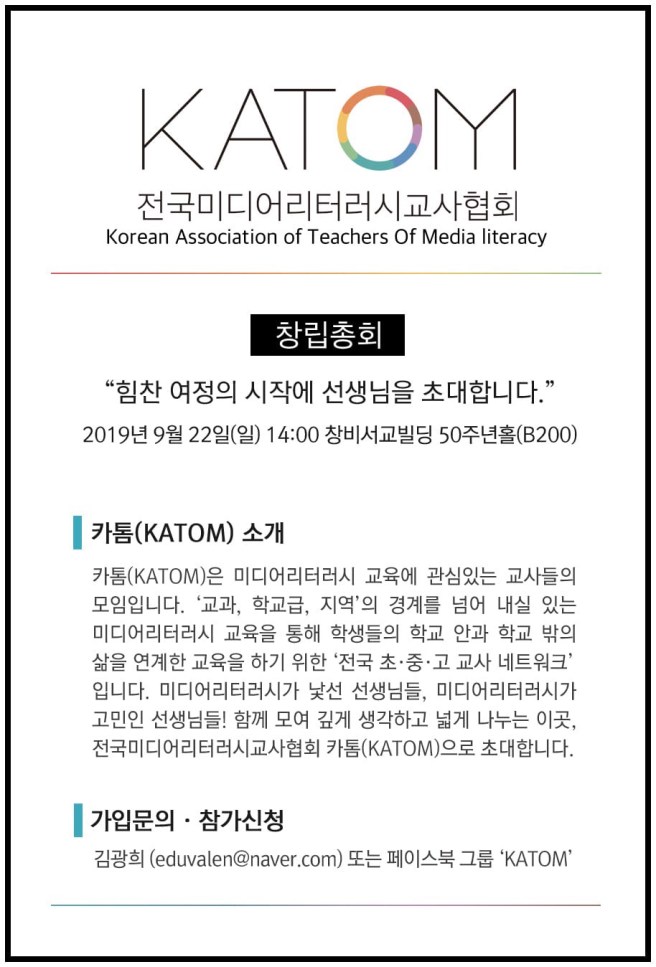 전국미디어리터러시교사협회(KATOM: Korean Association of Teachers Of Media Literacy)가 오는 9월 22일(일) 오후2시에 서교창비센터 50주년 기념홀에서 창립총회를 한다는 소식. 초중고 학교급과 교과의 경계를 뛰어넘어 미디어리터러시를 고민하고 교육하는 초중고 교사 단체이다.