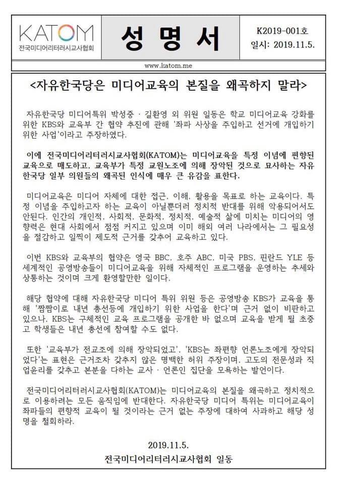 자유한국당은 미디어 교육 자체를 정치적으로 편향된 것으로 바라보는 잘못된 인식을 조속히 바로잡고, 관련 성명서를 철회하기 바랍니다. 그리고 지난 박근혜 정부 시기부터 정권을 초월하여 교육정책으로 추진되어온 미디어 리터러시 교육의 본질이 미래 세대의 핵심 역량을 기르는 것임을 올바로 이해하고, 위기에 처한 학교 교육의 현실을 고려하여 미디어 교육의 미래지향적 발전에 동참해 주기를 간절히 바랍니다.