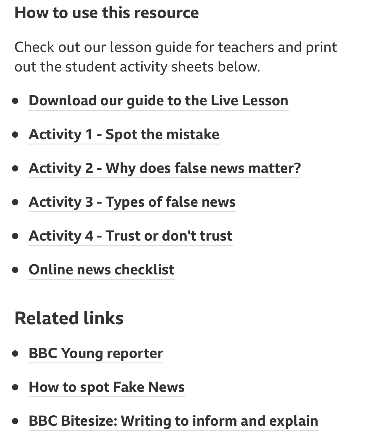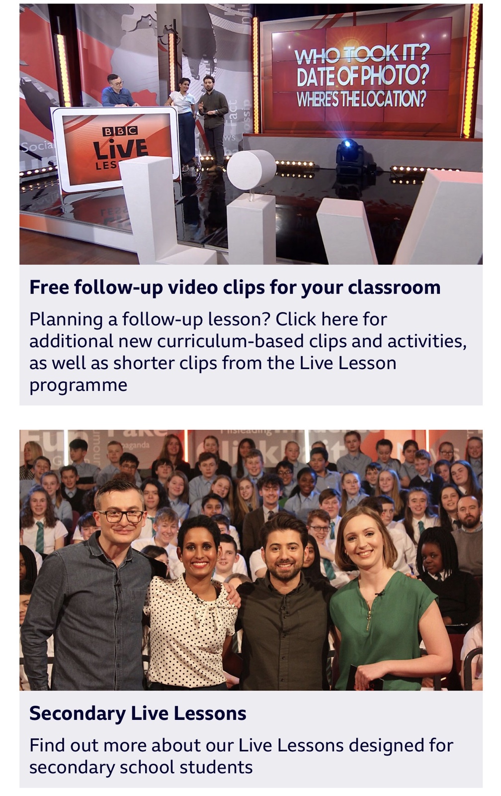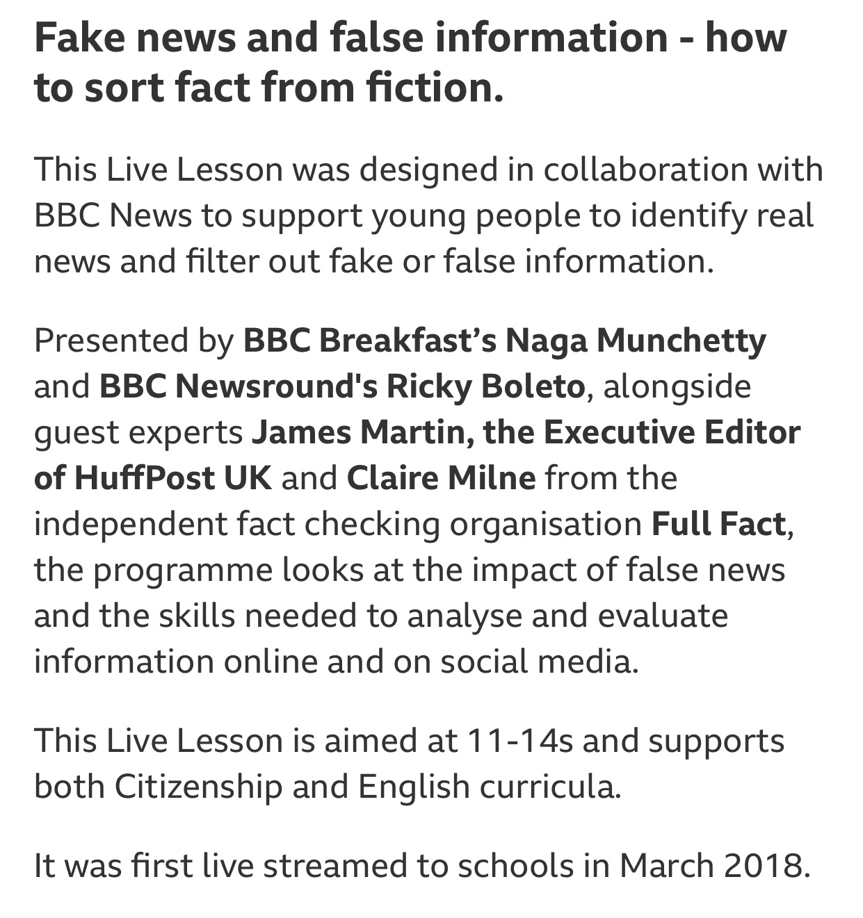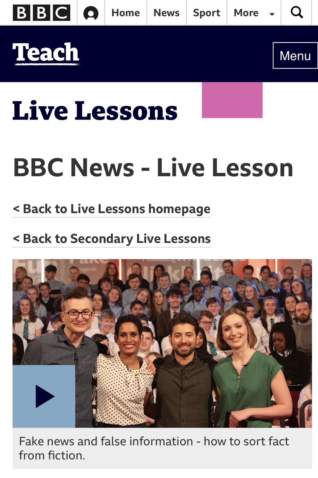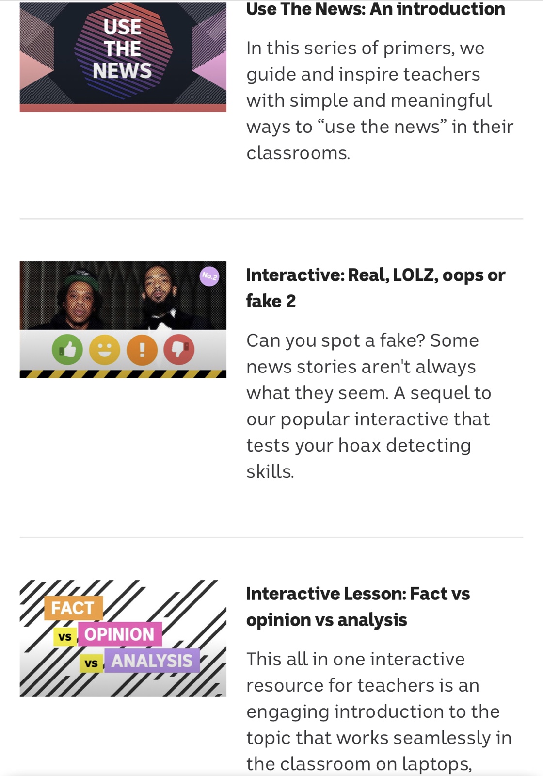 영국의 BBC 방송은 BBC Teach라는 웹사이트를 통해 초중등 학교급 및 성인을 위한 다양한 과목과 주제의 학습을 위해 활용할 수 있는 생생한 영상 자료, 레슨 플랜, 게임 등을 제공하고 있습니다. ‘가짜 뉴스와 거짓 정보 가려내기’ 교육 자료와 활동 안내는 미디어 교육 분야의 자료 예시입니다.
