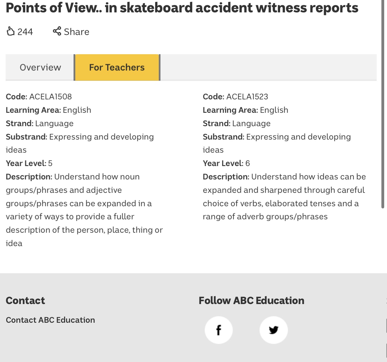 아래에 제시한 “스케이트 보드 충돌 사건으로 본 시점과 보도”라는 자료는 ABC Splash에서 제공하고 있는 초등 5-6학년 수업 자료입니다. 그 내용은 일상생활에서 흔히 겪을 수 있는 사고인 스케이트보드 충돌 사건을 예시로 하여, 이를 바라보는 세 가지 시점에서 명사, 의견이 담긴 형용사, 시제 표현 등이 해당 사건 및 이와 관련된 사람들을 바라보는 특정한 관점의 표명과 재현을 위해 어떻게 사용되는지를 비판적으로 분석할 수 있게 한 것으로, 학교 교육과정과의 연계 사항 및 활용 팁을 제공하고 있는 훌륭한 국어 수업 자료이자 미디어 리터러시 교육 자료입니다.