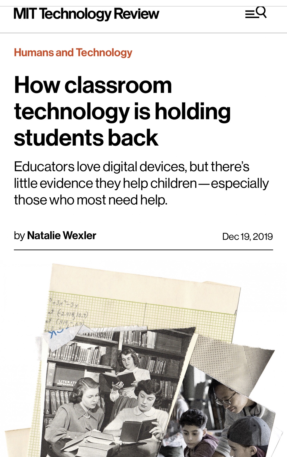 에듀테크(edu-tech) 옹호론자들에게는 ‘불편한 진실’이겠지만, 저학년 학생들의 학교 수업에서는 아이패드 등의 디지털 교육 수단이나 이른바 개인의 특성/능력별 맞춤교육 프로그램이 학생들의 학습효과에 도움된다는 증거를 찾을 수 없었다고 한다. 특히 평소 기본적인 문해력(읽기능력 등)이 제대로 갖추어지지 않은 저소득층의 학생들에게는 오히려 디지털 교육수단이 학생들을 아이패드와 모니터 앞에 방치하는 결과를 초래해 오히려 디지털 교육격차를 심화시킨다는 미국 교육전문가의 기고문.