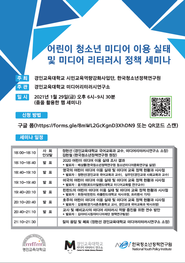 경인교육대학교 시민교육역량강화사업단과 한국청소년정책연구원이 공동 주최하고, 경인교육대학교 미디어리터러시연구소가 주관하는 ‘어린이 청소년 미디어 이용 실태 및 미디어 리터러시 정책 세미나’가 2021년 1월 29일(금) 오후 6시~9시 30분까지 온라인 세미나로 개최됩니다.