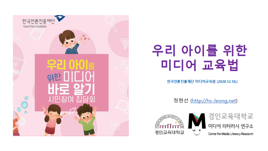 2020년 12월 18일에 한국언론진흥재단 미디어교육원이 주최한 “우리 아이를 위한 미디어 바로 알기 시민참여 집담회”에서 맡았e던 특강 자료입니다.