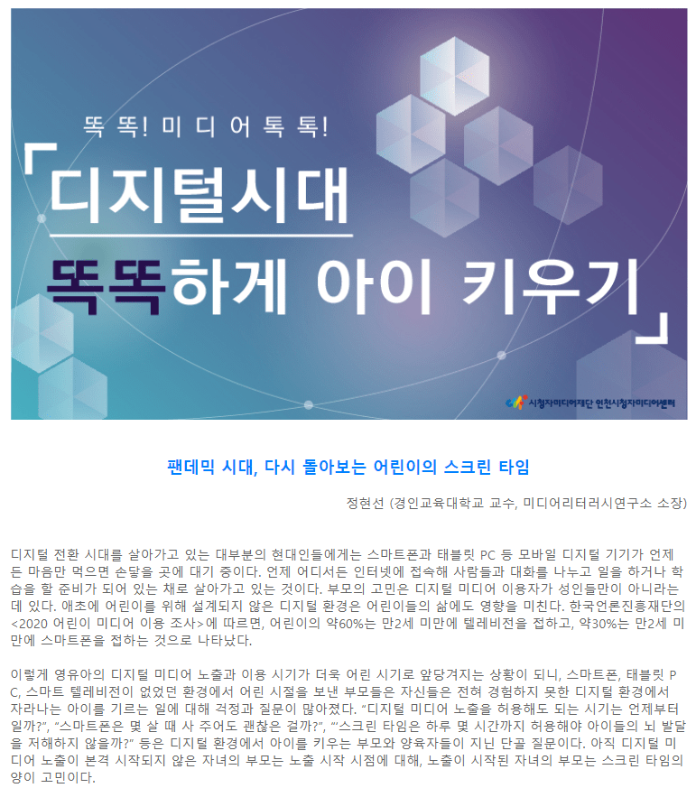 2018년부터 3년 연속으로 ‘인천시청자미디어센터’의 발전협의회 위원으로 참여 중인데요, 인천센터의 올해 뉴스레터가 새단장을 하며 다양한 칼럼이 신설되었습니다. “똑똑! 미디어 톡톡!: 디지털 시대 똑똑하게 아이 키우기” 코너에 올해 총4회 칼럼을 기고하게 되었는데, 첫번째 칼럼으로 “팬데믹 시대, 다시 돌아보는 어린이의 스크린 타임”을 썼습니다. 올해 새롭게 시작하는 부모 미디어 교육에 대한 연구의 바탕에 깔린 고민과 방향도 담았습니다. 읽는 분들께 도움이 되면 좋겠습니다.