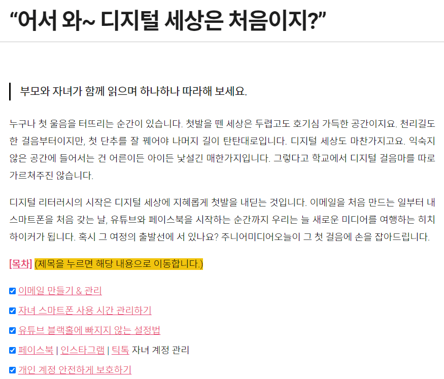 자녀의 이메일 계정 만들기, 자녀의 스마트폰 사용 시간 관리하기, 유튜브 이용 관리하기, 페이스북/인스타그램/틱톡 자녀 계정 관리하기, 개인 계정 안전하게 보호하기 등 부모가 정성과 시간을 들여 코칭을 해 주어야 할 꿀팁들을 “주니어미디어오늘”에서 한 자리에 모아 두었습니다.