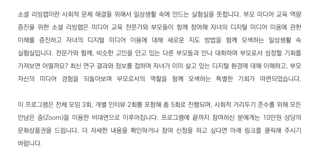 올해는 초등 5, 6학년 또는 중학교 1, 2학년 자녀가 있는 부모님들로서, 자녀의 스마트폰, 유튜브, SNS, 게임 이용을 어떻게 이해하고 지도해야 할 지 고민이 되는 분들을 모시고 소셜 리빙랩 방식의 부모 미디어 교육 프로그램을 시범적으로 진행하고자 합니다.