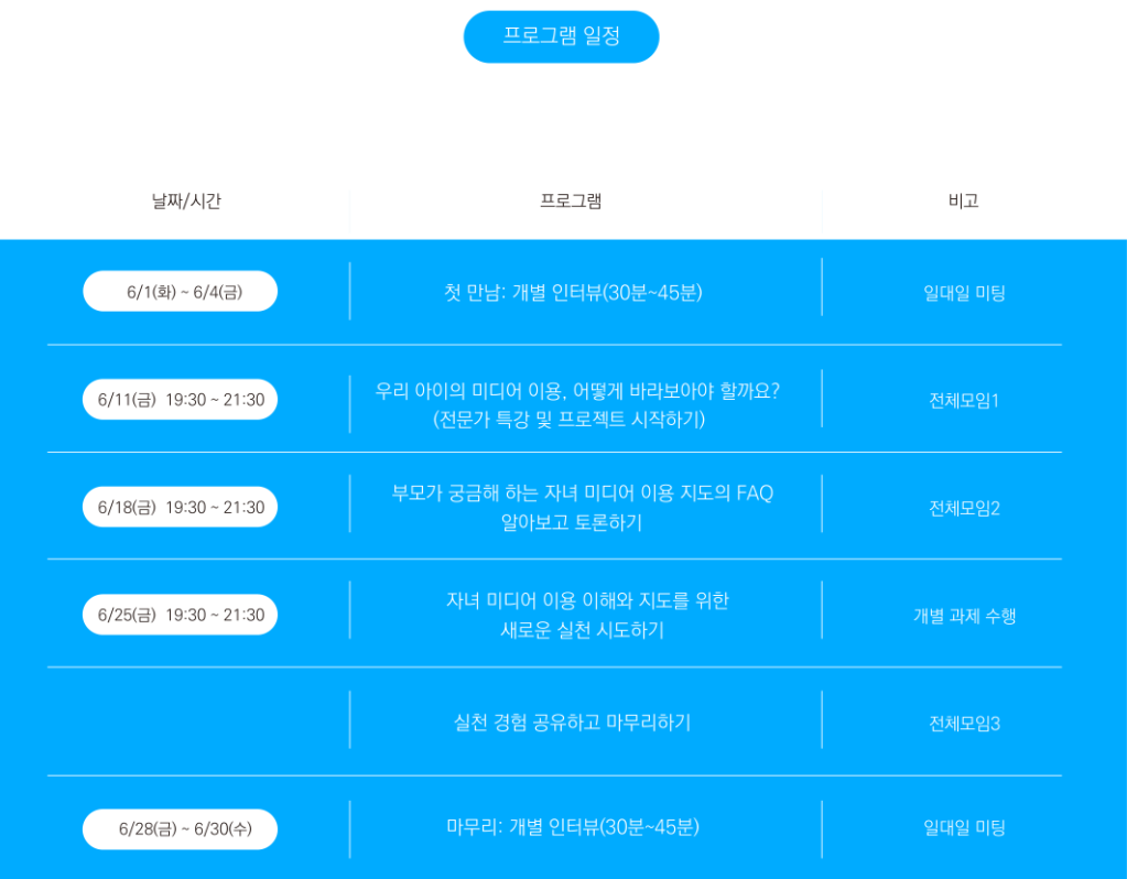 미디어 교육 전문가 및 다른 부모들과 만나 자녀가 이미 살아가고 있는 디지털 미래에 대해 함께 대화하고 실천하며 부모로서 성장하고자 하는 열린 마음을 지닌 부모님들의 적극적인 참여를 바랍니다.
