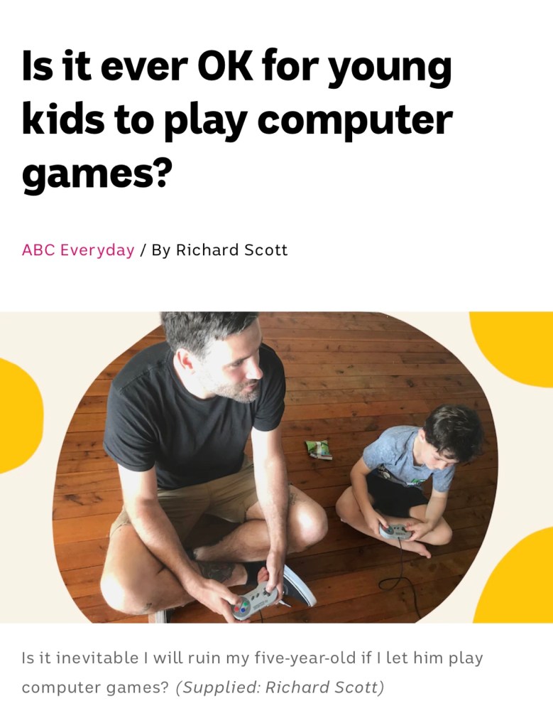 어린이들이 이용하는 모든 미디어 이용 시간(screen time)의 내용, 질, 방법이 다 똑같은 것은 아니죠. 이와 관련하여, “다섯 살짜리 우리 아이가 비디오 게임을 하는 것은 위험한 건가요?”라는 질문에 대해 이 문제를 바라보는 뇌 연구 기반의 연구와 문화연구 기반의 연구를 균형 있게 소개하고 있는 호주 ABC 방송의 기사입니다.