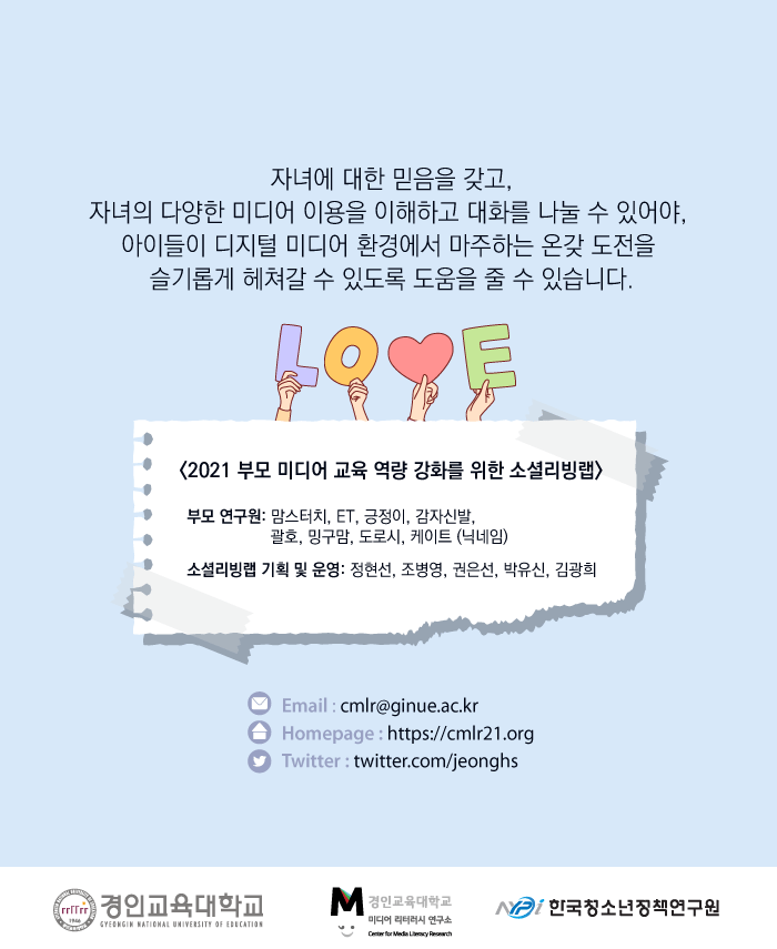 참여하신 부모님들, 함께 기획하고 운영한 연구진들 모두 수고 많으셨습니다! 뜻깊은 연구를 지원해 주신 한국청소년정책연구원에도 깊은 감사를 드립니다. 비슷한 나이의 자녀를 둔 부모와 양육자들께 도움이 되길 바랍니다.